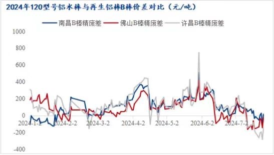 隨著鋁價(jià)的大幅回落,鋁水棒加工費(fèi)也逐步回歸至往年中高位置。而再生鋁棒受廢鋁原材料高企制約,加上鋁價(jià)持續(xù)回落,企業(yè)長(zhǎng)期處于虧損狀態(tài),再生鋁棒價(jià)格相比鋁水棒價(jià)格表現(xiàn)更加堅(jiān)挺。就B棒而言,目前周均結(jié)算加工費(fèi)在200-400元/噸,點(diǎn)價(jià)結(jié)算加工費(fèi)在350-550元/噸,價(jià)格已趕超原生棒價(jià)格。7月份B棒精廢差在-300~100元/噸區(qū)間震蕩盤(pán)整,且長(zhǎng)期處于負(fù)值,精廢差倒掛。在高生產(chǎn)成本下,企業(yè)不得不集體挺價(jià)保利接單,下游對(duì)目前價(jià)格接受度有限,多采購(gòu)原生棒居多,再生鋁棒市場(chǎng)需求遇冷。