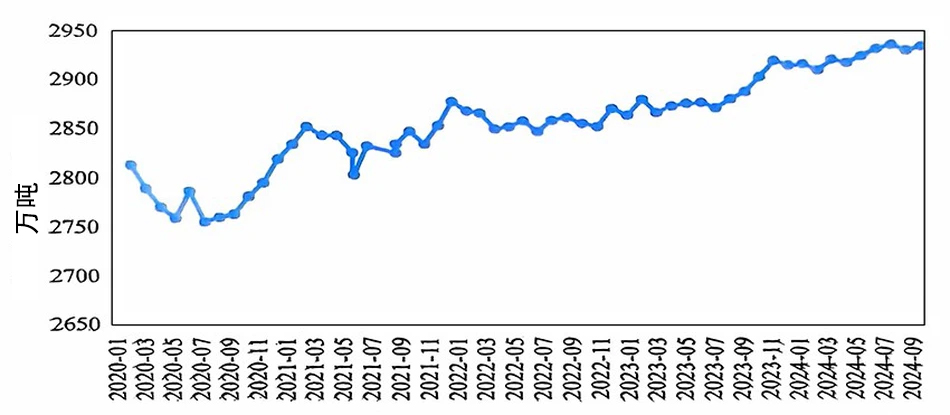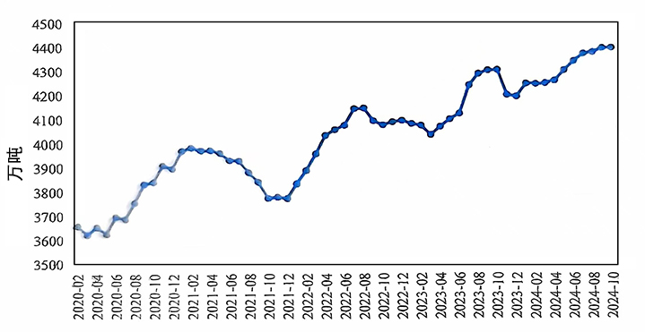 2024年10月,國內(nèi)電解鋁繼續(xù)保持穩(wěn)定生產(chǎn)。10月國內(nèi)電解鋁建成產(chǎn)能4462萬噸/年,運(yùn)行產(chǎn)能4363萬噸/年,較上月增加12萬噸/年,主要因?yàn)樗拇、貴州等地技改產(chǎn)能逐步復(fù)產(chǎn)及新疆置換項(xiàng)目啟槽。本月開工率約98%,為歷史新高。10月份產(chǎn)量為373萬噸,環(huán)比增長3.4%,同比增長2.1%,日均產(chǎn)量12.0萬噸,環(huán)比持平。