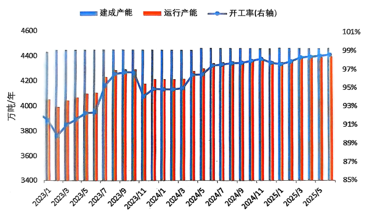 2025上半年,中國鋁行業(yè)生產(chǎn)總體較為穩(wěn)定,沒有出現(xiàn)因各種不可抗力因素導(dǎo)致的規(guī)模化減產(chǎn),且隨著四川、貴州、青海等省/區(qū)電解鋁企業(yè)的復(fù)產(chǎn)和新建項目投產(chǎn),上半年生產(chǎn)能力得到持續(xù)提升。安泰科統(tǒng)計,截至2025年6月底,中國電解鋁建成產(chǎn)能4470萬噸/年,其中運(yùn)行產(chǎn)能4405萬噸/年,較2024年底增加49萬噸。1-6月份產(chǎn)能利用率達(dá)98.1%,不斷刷新歷史新高,比去年同期高2.4個百分點(diǎn):其中6月份產(chǎn)能利用率達(dá)98.5%,較2024年末高0.9個百分點(diǎn)。2025上半年,中國電解鋁產(chǎn)量約為2184萬噸,同比增加2.4%。