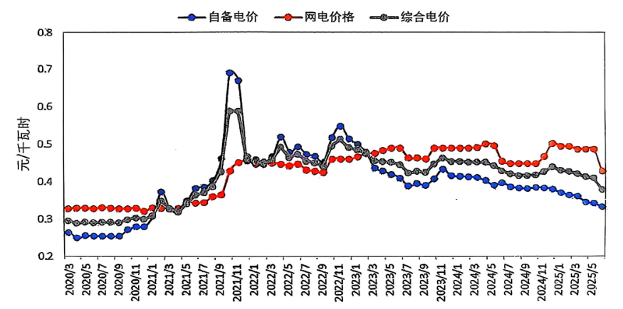 電力成本下降。截至6月底,中國電解鋁運(yùn)行產(chǎn)能中的自備電比例約55%;網(wǎng)電比例約45%。煤炭價格的持續(xù)下滑導(dǎo)致鋁企自備電價降低是2025年以來電解鋁行業(yè)電力成本下降的主要原因。2025年以來,煤炭主產(chǎn)區(qū)煤礦復(fù)產(chǎn)節(jié)奏加快,進(jìn)口煤到港量維持高位;而電煤因暖冬影響需求疲軟,非電行業(yè)又處于淡季,煤炭供應(yīng)寬松但需求疲軟,導(dǎo)致煤炭價格呈下行態(tài)勢,鋁廠自備電價逐步下跌。此外,廣西、云南、四川等地區(qū)網(wǎng)電價格均有不同程度的下調(diào),進(jìn)一步促進(jìn)了鋁企電力成本的下降。根據(jù)安泰科統(tǒng)計,2025年6月份自備電加權(quán)平均價格為0.332元/千瓦時,較2024年末下降0.048元/千瓦時,較2024年同期下降0.065元/千瓦時;網(wǎng)電價格為0.428元/千瓦時,較2024年末下降0.074元/千瓦時,較2024年同期下降0.0276元/千瓦時;綜合加權(quán)平均電價為0.379元/千瓦時,較2024年末下降0.0507元/千瓦時。1-6月份綜合加權(quán)平均電價為0.414元/千瓦時,同比下降0.034元/千瓦時。