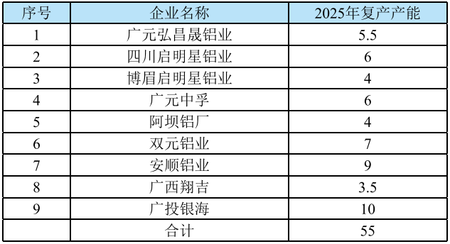 表1-2 2025年中國(guó)電解鋁復(fù)產(chǎn)產(chǎn)能變動(dòng)情況(萬(wàn)噸/年)