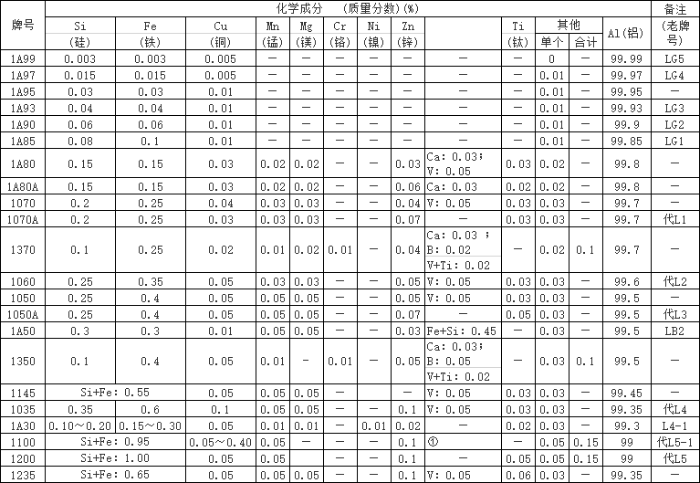 7-1系列純鋁及鋁合金牌號及化學成分表: